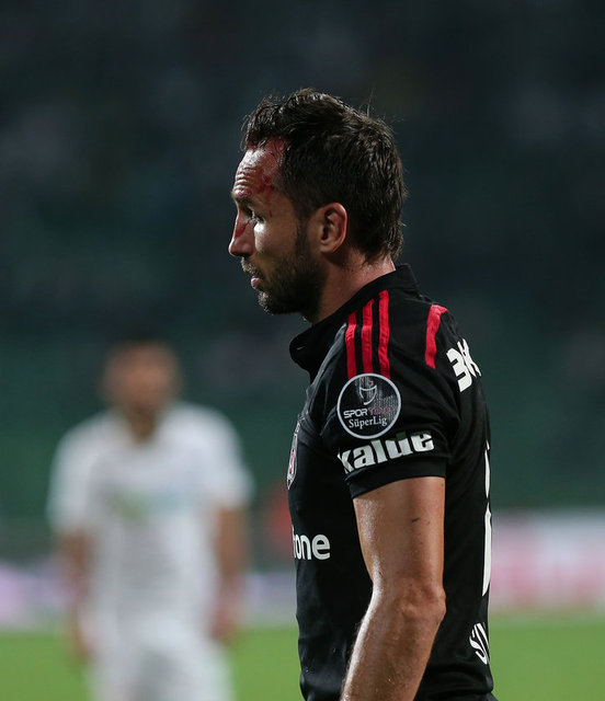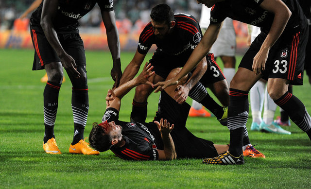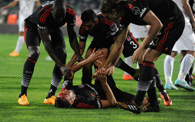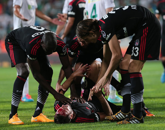 Bursasporlu futbolcu Renato Civelli ile girdiği hava topu mücadelesi sonrası rakibinin tekmesi yüzüne gelen Sivok kanlar içinde yerde kaldı.