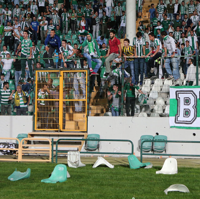 Hakemin bitiş düdüğünün ardından bazı taraftarlar sahaya girmeye çalışırken, bazıları da koltukları içeriye attı. -