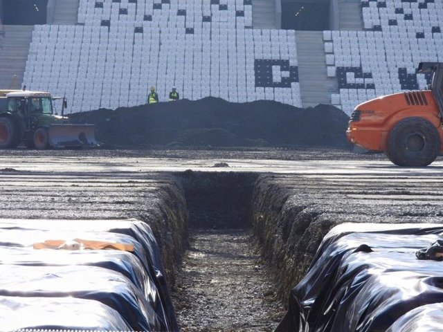 Futbol sahasında bulunan 3 vinçten ikisi sökülürken, orta bölüm temizlendi. Son vinçin de sökülmesinin ardından çimlendirme çalışmaları başlayacak.