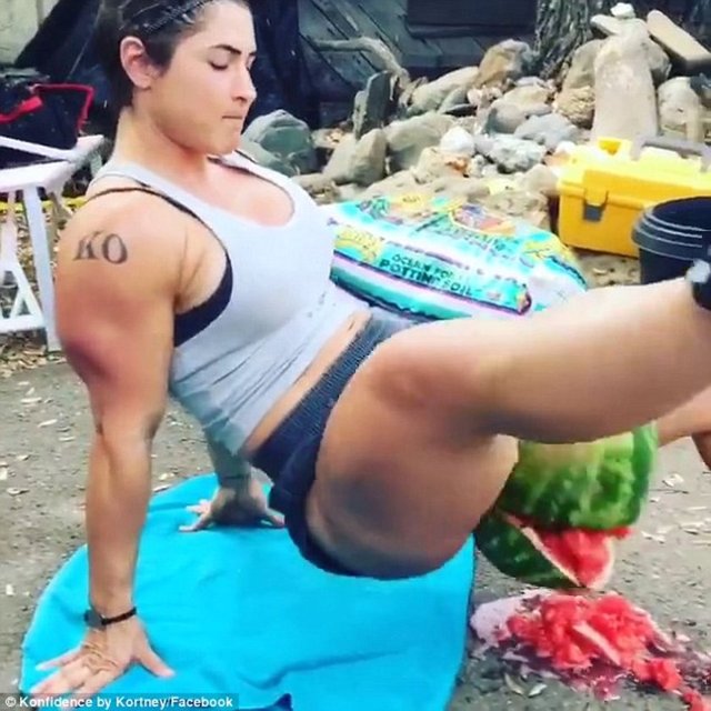 Kortney, bacakları arasında kırdığı karpuz videosunu Facebook hesabından paylaşınca kısa süre içersinde 6 milyona yakın kişi tarafından izlendi.