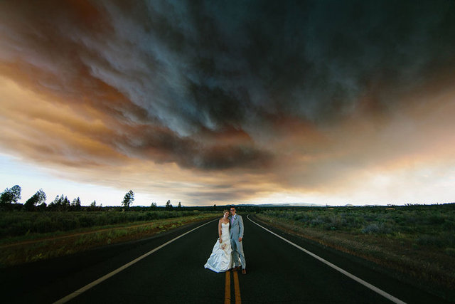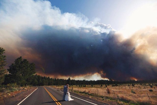 Kır düğünü konseptinde nikah masasına oturan çift yakınlarda çıkan orman yangını karşısında şoke oldular.