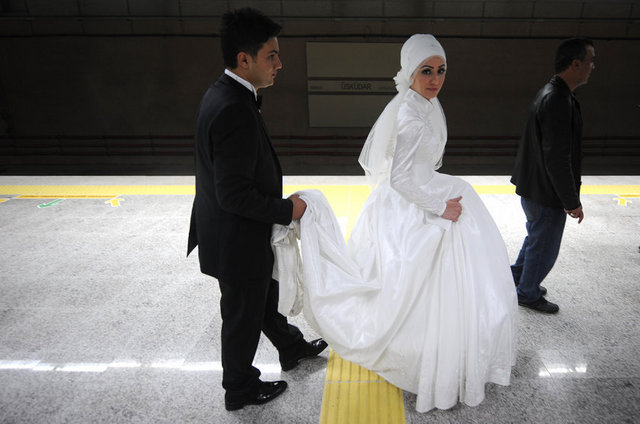 - Kartal Bülent Ecevit Kültür Merkezi'ndeki düğünlerinin ardından Marmaray'ın Üsküdar istasyonuna gelen çift, bol bol fotoğraf çektirerek, en mutlu günlerini ölümsüzleştirdi.