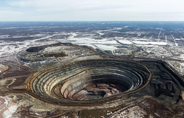- Daha önce 158,2 karat ağırlığında ve 1,5 milyon dolar değerinde tek parça elmasın bulunduğu maden dev yapısıyla şaşırtıyor. Derinliği 571 metre, çapıysa 1 kilometre olan bu maden yatağı uzaydan bile rahatlıkla görülebiliyor.