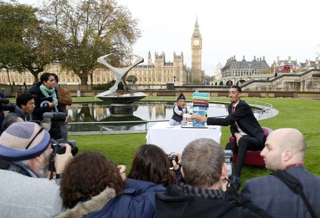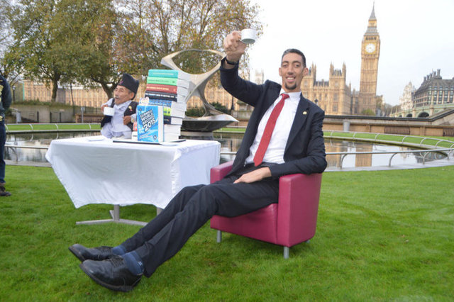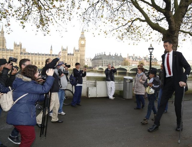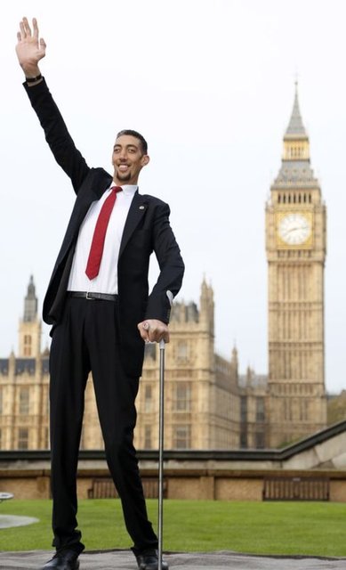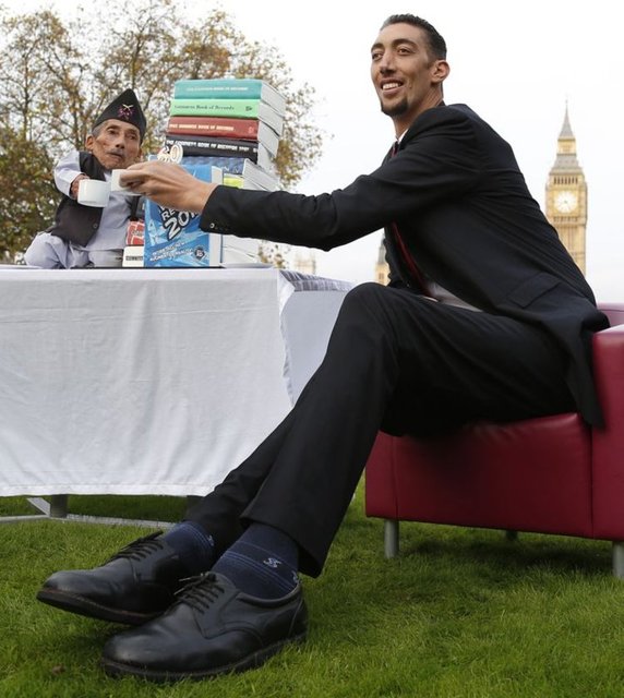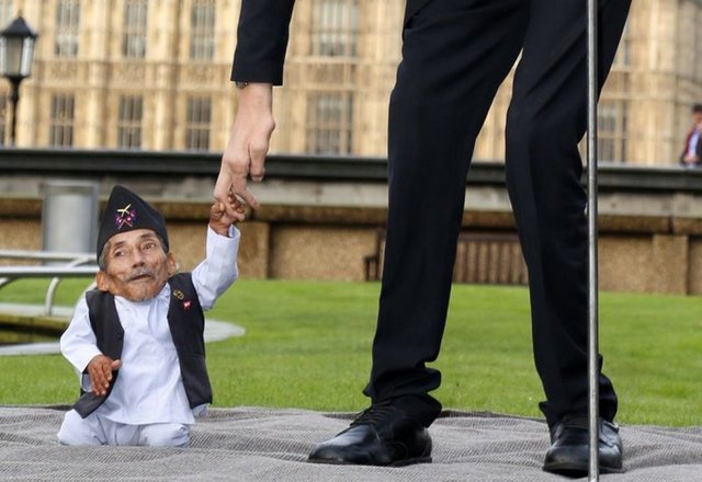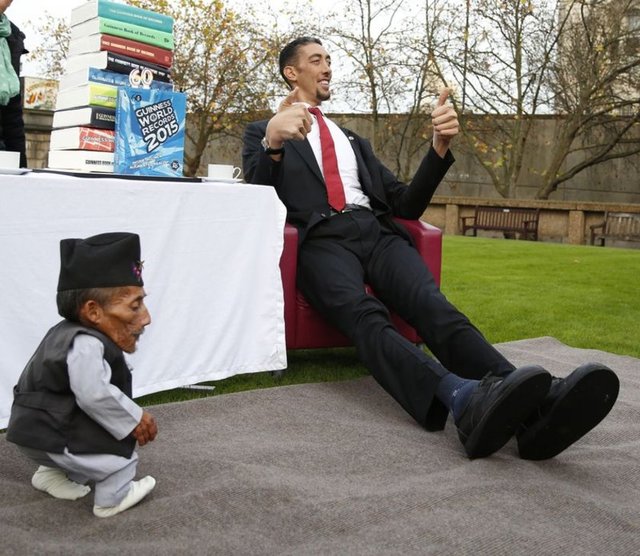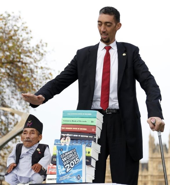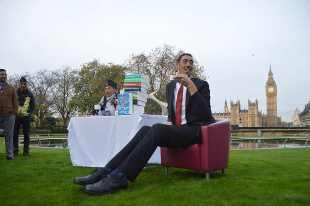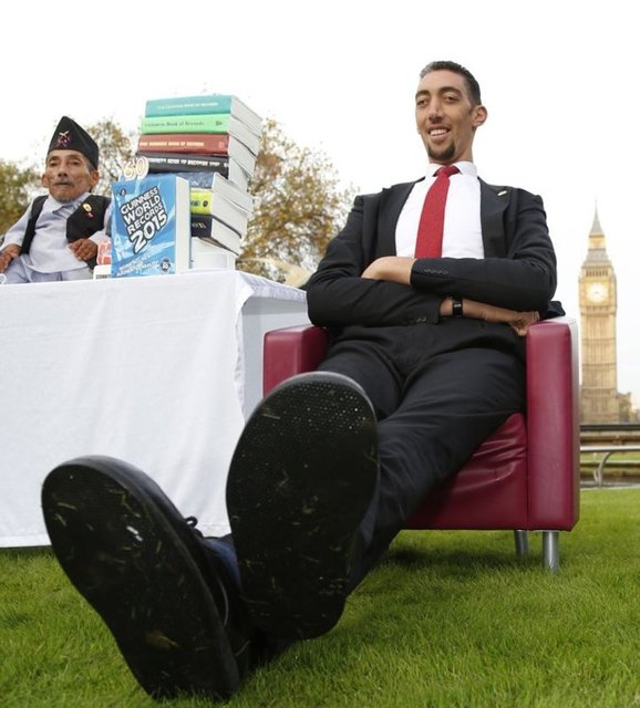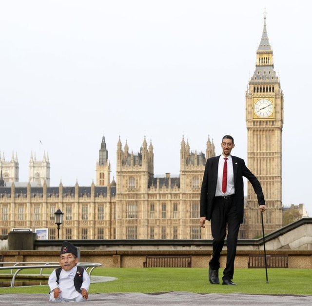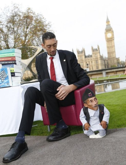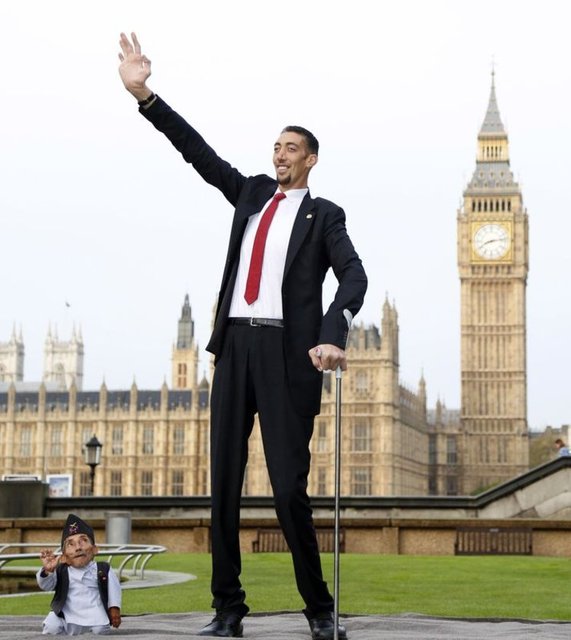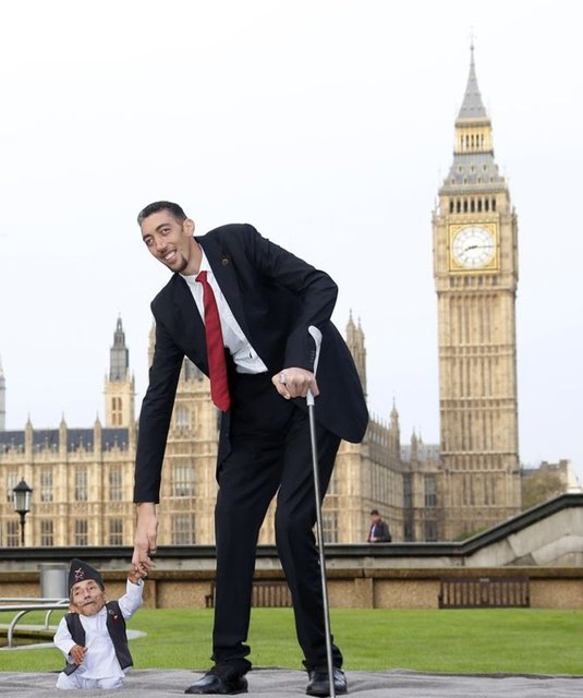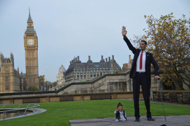 'Dünyanın en uzun boylu adamı' unvanına sahip Sultan Kösen ile 'dünyanın en kısa boylu adamı' olan Nepalli Chandra Bahadur Dangi İngiltere'de bir araya geldi