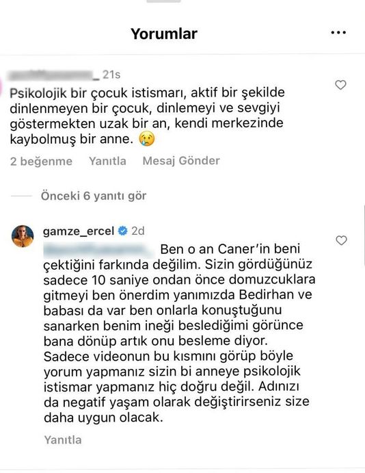 Yoruma sinirlenen Gamze Erçel ise "Ben o an Caner'in beni çektiğinin farkında değilim. Sizin gördüğünüz sadece 10 saniye. Ondan önce domuzcuklara gitmeyi ben önerdim. Yanımızda Bedirhan ve babası da var. Ben onlarla konuştuğunu sanırken benim ineği beslediğimi görünce bana dönüp 'Artık onu besleme' diyor. Sadece videonun bu kısmını görüp böyle bir yorum yapmanız, sizin bir anneye psikolojik bir istismar yapmanız hiç doğru değil" sözleriyle karşılık verdi.