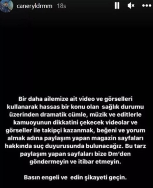"Bir daha ailemize ait video ve görselleri kullanarak hassas bir konu olan sağlık durumu üzerinden dramatik cümle, müzik ve editlerle kamuoyunun dikkatini çekecek videolar ve görseller ile takipçi kazanmak adına paylaşım yapan magazin sayfaları hakkında suç duyurusunda bulunacağız. Bu tarz paylaşım yapan sayfaları bize DM'den göndermeyin ve itibar etmeyin. Basın engeli ve edin şikayeti geçin."