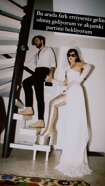 Gelinliğinin altına topuklu uzun bir bot giyen 39 yaşındaki şarkıcı, sosyal medya üzerinden takipçilerine; "Bu arada fark ettiyseniz gelin olmuş gidiyorum ve akşam ki partimi bekliyorum" sözleriyle seslendi.