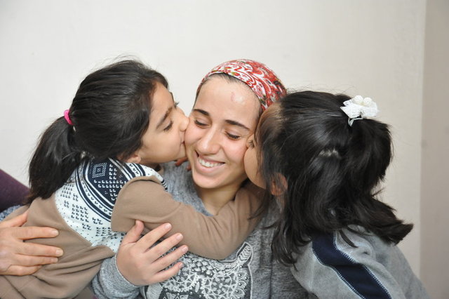 Gaziantep'te eşinin bıçakla yaptığı işkencelerin ardından tüfekle vurduğu sol bacağı diz üstünden kesilen, 17 haftalık hamile Çağlar Aşık, tedavisinin ardından taburcu edildikten sonra yerleştiği ağabeyinin evinde 23 gündür göremediği çocuklarıyla kucaklaştı.