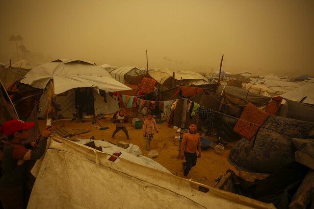 Gazze Şeridi’ni 2 gündür etkisi altına kum fırtınası, yıpranmış çadırların savrulmasına yol açarken, yerinden edilen Filistinlilerin sıkıntılarını daha da artırdı.