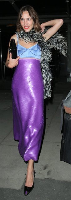 Alexa Chung, gecenin sonunda mavi ve mor renkli dikkat çeken kombini ile böyle görüntülendi. Ünlü sunucunun bir hayli neşeli olduğu görüldü.
