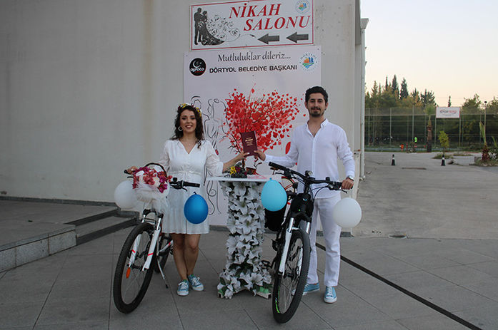 Nikah törenine gelin arabası yerine bisikletle gitmeyi tercih eden çift, giydikleri gelinlik ve damatlıkla 10 kilometre pedal çevirerek Dörtyol Belediyesi nikah salonuna ulaştı.
