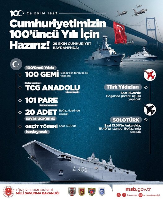 Milli Savunma Bakanlığı, Cumhuriyet'in 100'üncü yılı dolayısıyla TCG Anadolu'nun da aralarında bulunduğu 100 savaş gemisinin İstanbul Boğazı'nda resmigeçit yapacağını açıkladı.