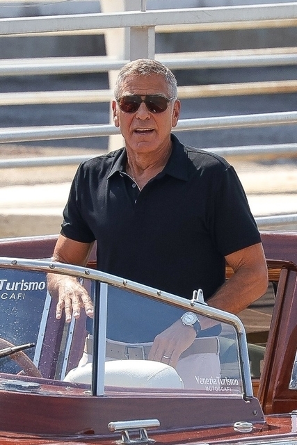 Amal Clooney kısa, sarı elbise ve büyük şapkasıyla, George Clooney de tişört ve pantolondan oluşan rahat stiliyle Venedik havasına uyum sağladı.