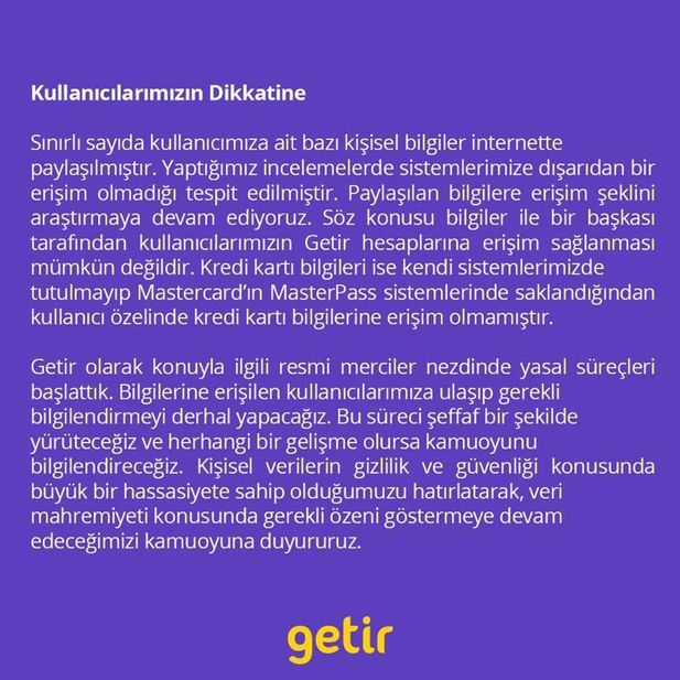 Getir'in sosyal medya hesabından konuya ilişkin açıklama yapıldı. Açıklamada bazı kişisel bilgilerin ele geçirildiği doğrulanırken, nasıl ele geçirildiğinin araştırıldığı vurgulandı. Açıklamada, söz konusu bilgiler ile Getir hesaplarına erişimin mümkün olmadığı eklendi. Ayrıca kredi kartı bilgilerinin Getir'in sisteminde değil MasterPass sistemlerinde saklandığı, bu yüzden de kullanıcı özelinde bu bilgilere erişimin mümkün olmadığı belirtildi.