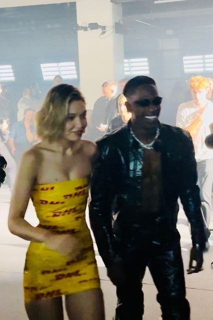 Defilede sergilenen koleksiyonun tasarımcısı Guram Gvasalia da Hadid'in yanındaydı ve elinden tutarak ona destek oldu.