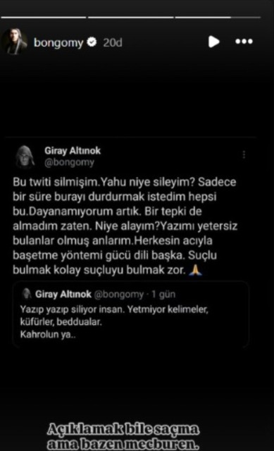 Söz konusu iddialara yanıt veren Giray Altınok, sildiği öne sürülen tivitini yeniden paylaşarak yalnızca hesabını bir süreliğine dondurduğunu ifade etti. Altınok, şu sözlerle hem iddiaları reddetti hem de tepkisini dile getirdi;