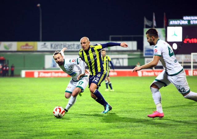 Fenerbahçe, Ziraat Türkiye Kupası çeyrek final ilk maçında Akın Çorap Giresunspor'u deplasmanda Fernandao'unun son dakikada penaltıdan attığı golle 2-1 mağlup etti.