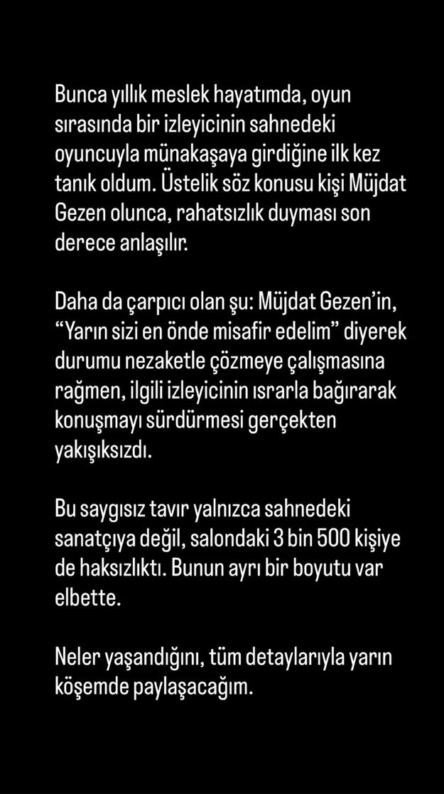 Yaşananlara tepki gösteren Gülben Ergen, "Bunca yıllık meslek hayatımda, oyun sırasında bir izleyicinin sahnedeki oyuncuyla münakaşaya girdiğine ilk kez tanık oldum. Üstelik söz konusu kişi Müjdat Gezen olunca, rahatsızlık duyması son derece anlaşılır. Daha da çarpıcı olan şu: Müjdat Gezen'in, "Yarın sizi en önde misafir edelim" diyerek, durumu nezaketle çözmeye çalışmasına rağmen, ilgili izleyicinin ısrarla bağırarak konuşmayı sürdürmesi gerçekten yakışıksızdı. Bu saygısız tavır yalnızca sahnedeki sanatçıya değil, salondaki 3 bin 500 kişiye de haksızlıktı. Bunun ayrı bir boyutu var elbette. Neler yaşandığını tüm detaylarıyla yarın köşemde paylaşacağım" ifadelerini kullandı.