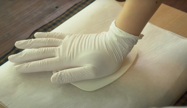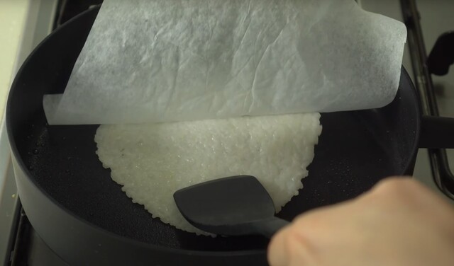 Tezgahınıza bir yağlı kağıt serin.Pirinç topunuzu üzerine yerleştirin ve onun üzerine bir yağlı kağıt daha koyun.