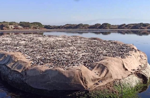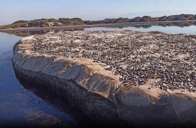 İtalya merkezli Akdeniz Deniz ve Kıyı Vakfı (MEDSEA) tarafından Sardunya Adası'nda 2 bin çuval midye kabuğu kullanılarak adacık inşa edildi