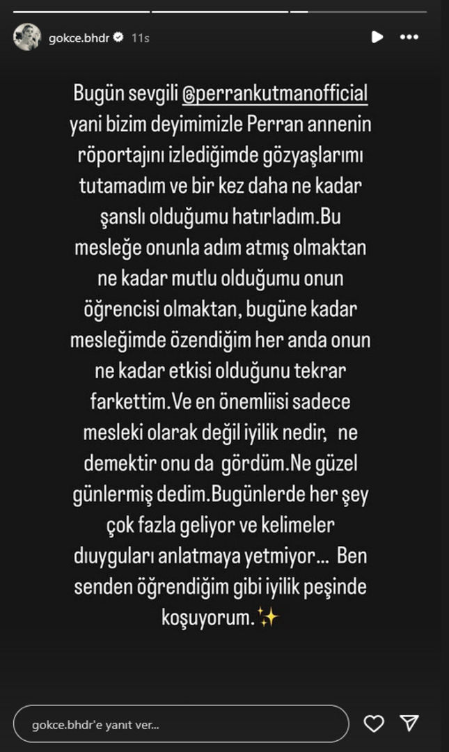 Ünlü oyuncu; "Sevgili Perran Kutman yani bizim deyimimizle 'Perran annenin röportajını izlediğimde gözyaşlarımı tutamadım ve bir kez daha ne kadar şanslı olduğumu hatırladım. Bu mesleğe onunla adım atmış olmaktan ne kadar mutlu olduğumu, onun öğrencisi olmaktan, bugüne kadar mesleğimde özendiğim her anda onun ne kadar etkisi olduğunu tekrar fark ettim. Ve en önemlisi sadece mesleki olarak değil iyilik nedir, ne demektir onu da gördüm. 'Ne güzel günlermiş' dedim. Bugünlerde her şey çok fazla geliyor ve kelimeler duyguları anlatmaya yetmiyor. Ben senden öğrendiğim gibi iyilik peşinde koşuyorum" mesajını yayımladı.