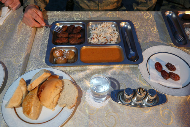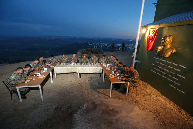 Bölgenin çatısı konumundaki zirvede hava tehditlerini önlemek için elleri tetikte nöbet tutan Mehmetçik, iftar saatinde bir araya geldikleri sofrada da oruçlarını nöbetleşe açıyor.