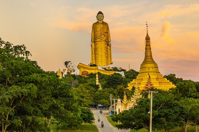 Myanmar’da bulunan dev bir Buda heykeli, biri ayakta diğeri uzanır halde tasvir edilmiş iki heykelden oluşur.