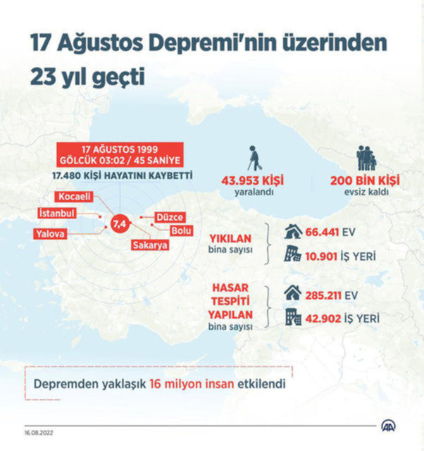 17 Ağustos 1999 Salı günü saat 03.02'de 7,4 büyüklüğünde meydana gelen ve 45 saniye süren Marmara Depremi; Kocaaeli, Yalova, Sakarya, İstanbul ve Düzce'de yıkıma neden oldu.