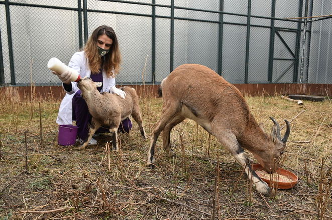 Erzurum ve Erzincan'da doğada bulunan, Gölge ve Bayram isimleri verilen dağ keçileri, koruma altına alındıkları Kafkas Üniversitesi Yaban Hayatı Kurtarma ve Rehabilitasyon Merkezinde, biberonla bebek gibi besleniyor.
