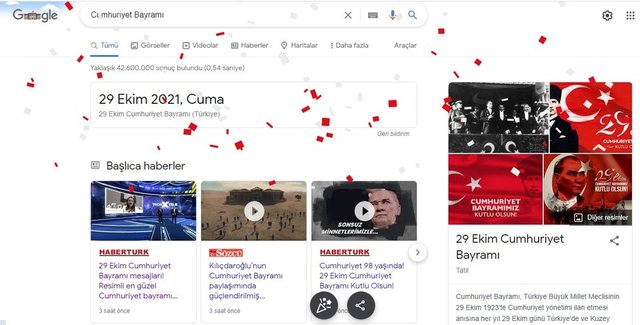 Dev arama motoru Google, Türkiye Cumhuriyeti'nin kuruluş tarihi olan 29 Ekim'i Doodle yaptı. Google'ın hazırladığı bu özel tasarım ile kırmızı-beyaz renklerle bezenmiş TBMM görseli ana sayfaya taşındı. Ana sayfa üzerindeki görselle Google, 29 Ekim Cumhuriyet Bayramı'nın tarihine ve hazırlanmış haberlere de erişim imkanı sağladı. Google Doodle'a tıklayınca kırmızı-beyaz konfetilerle Cumhuriyet Bayramı aramasına gidilebiliyor. Bu sene 98. yılı olan Cumhuriyet Bayramı her yıl etkinlikler ile kutlanıyor.
