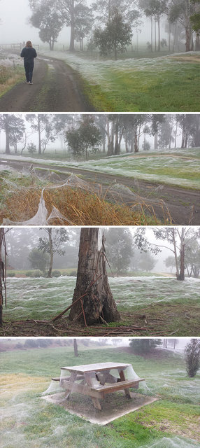 Avustralya'nın Victoria eyaletinde örümcek ağıyla kaplanan bir bölge.