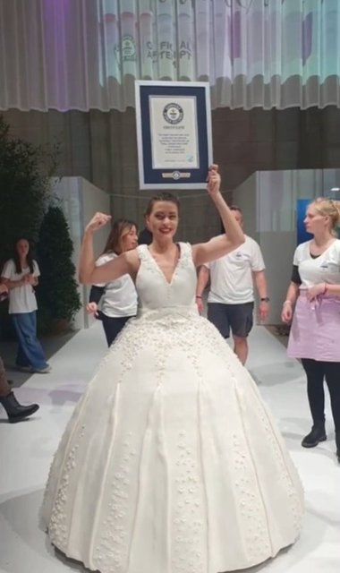 İsviçre'den bir fırıncı, dünyanın en büyük giyilebilir pasta elbisesini yaratarak dünya rekoru kırdı.