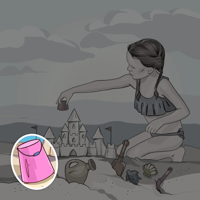 Cevap: Çocuğun yaptığı kumdan kalenin üzerinde olması gereken bayrak flaması, kovanın üzerinde duruyor.