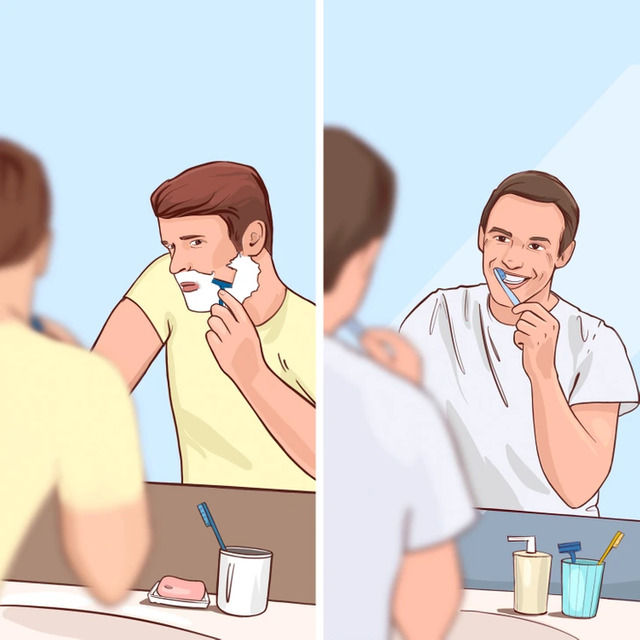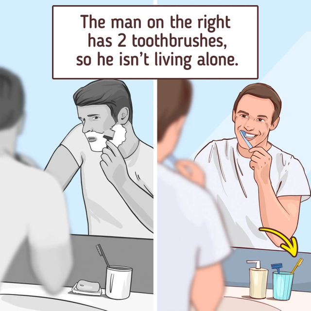 Cevap: Sağdaki kişinin banyosundaki bardakta ekstra bir diş fırçası daha var bu yüzden o kişinin birlikte yaşadığı birisi var.