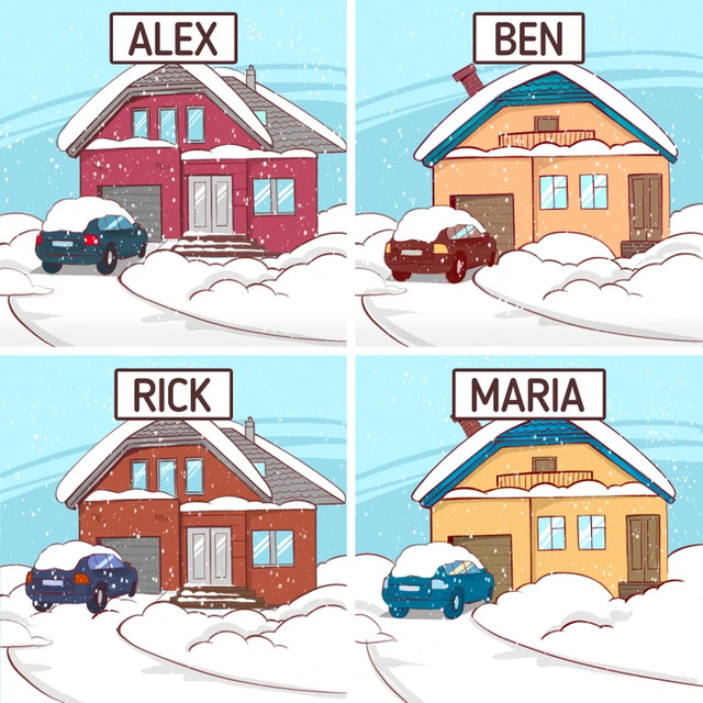 Cevap: Rick yani sol alt görseldeki kişi, kar yağıp biriktikten sonra geri gelmiş. Diğer kişilerin arabalarını park ettikleri kısım düz çünkü kar arabalarının üstüne yağdı dolayısıyla arabanın alt kısmında kar çok birikemedi. Yani hırsız Rick.