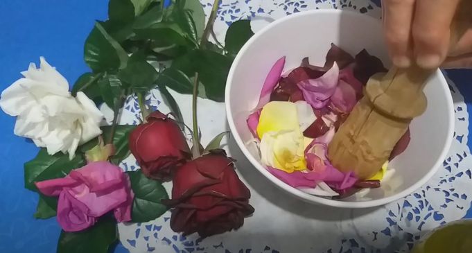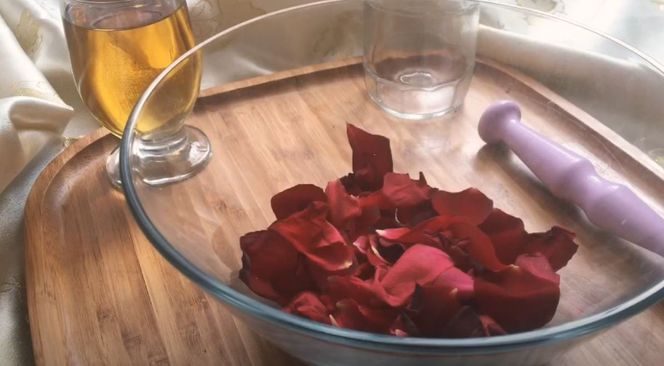2 yemek kaşığı bal, 1 çay kaşığı gül yağı, 1 yemek kaşığı gül suyu, Birkaç adet gül yaprağı