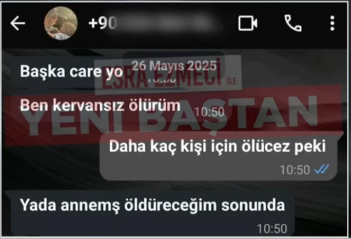 Tuğyan Ülkem Gülter'in 26 Mayıs 2025'te yakın arkadaşı Bircan Dülger'e yolladığı; "Başka çare yok, ben Kervan'sız ölürüm ya da annemi öldüreceğim" mesajını gönderdiği oürtaya çıktı.