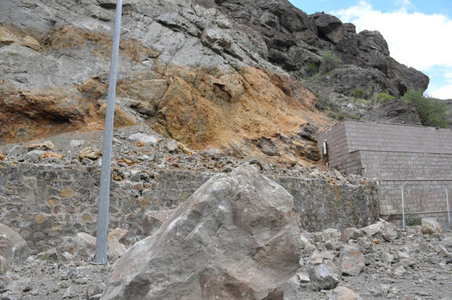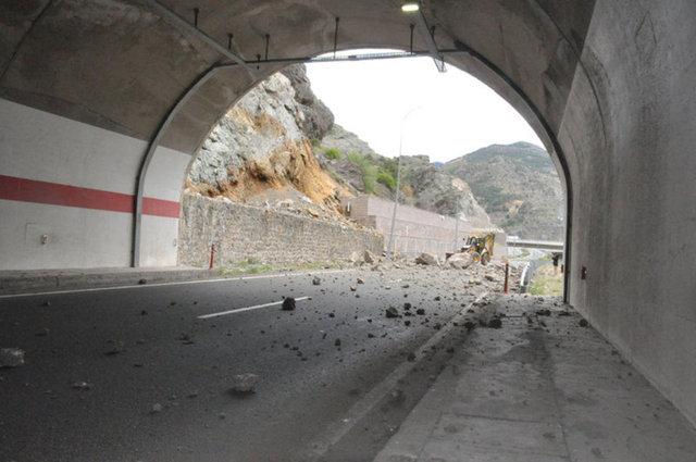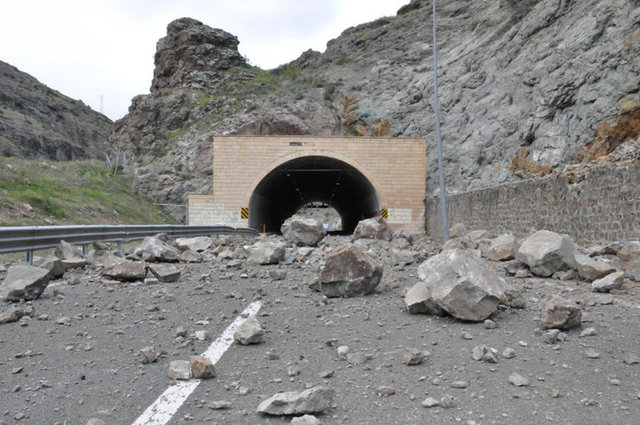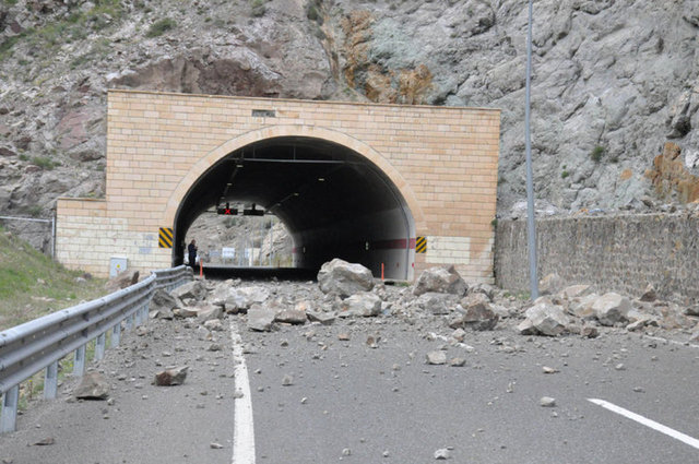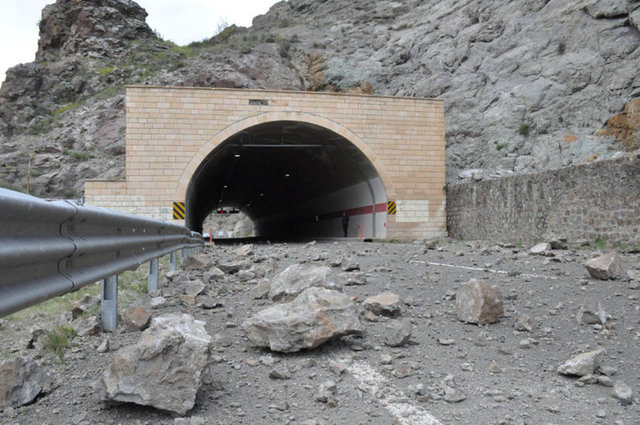Yol kenarındaki yamaçtan kopan toprak ve kaya parçaları, tünel girişindeki kara yoluna aktı.