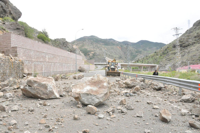 Tonlarca ağırlıktaki kaya parçaları ve toprak nedeniyle kara yolu, ulaşıma kapandı.
