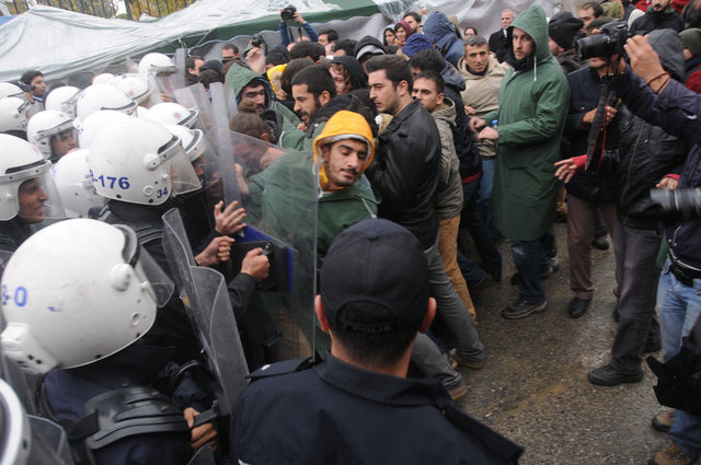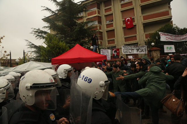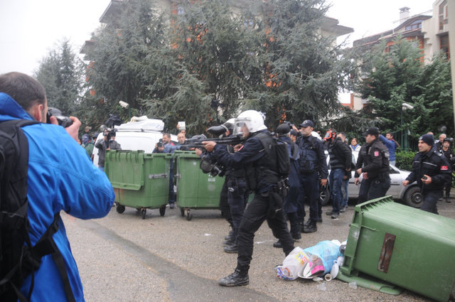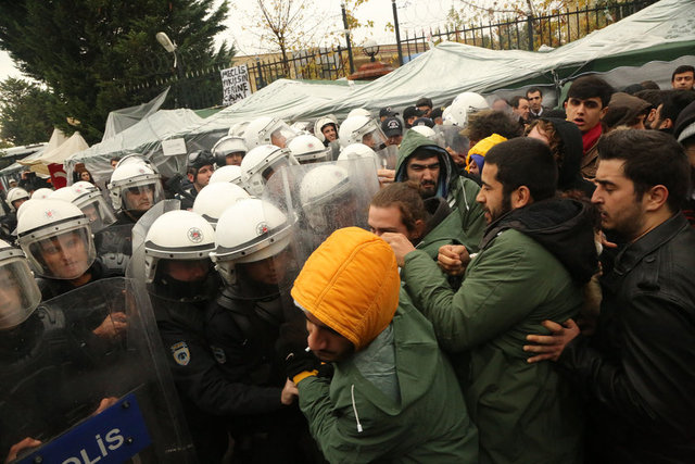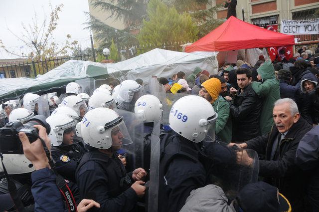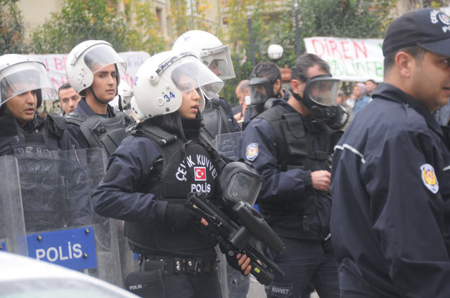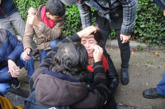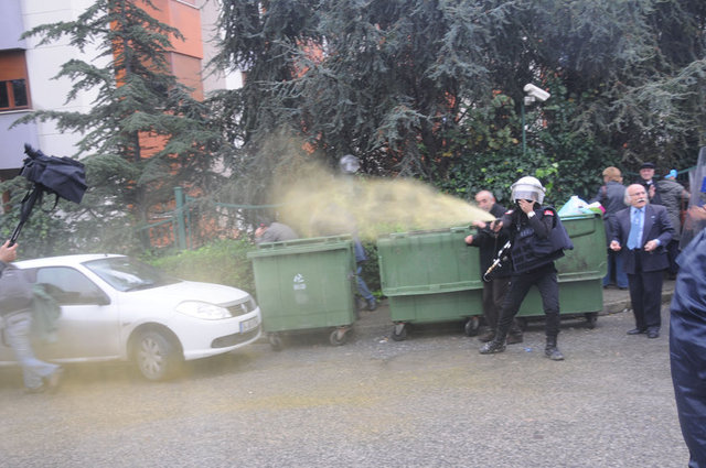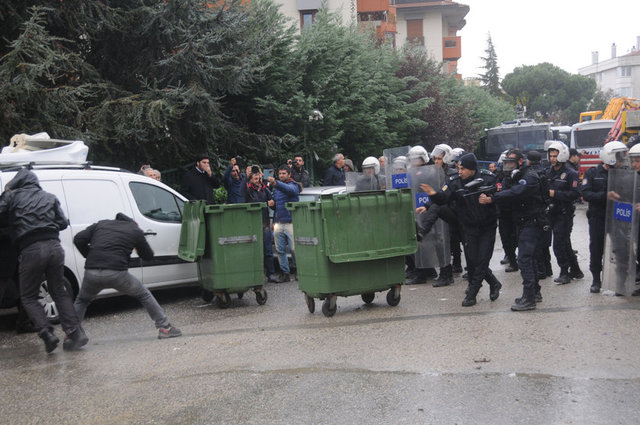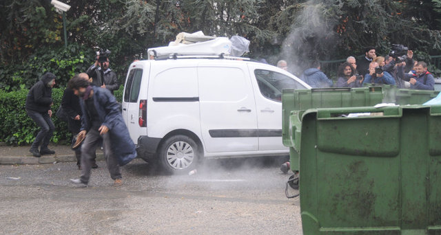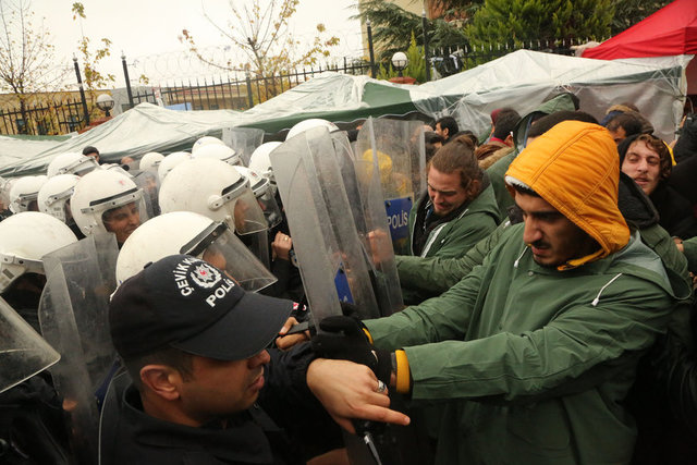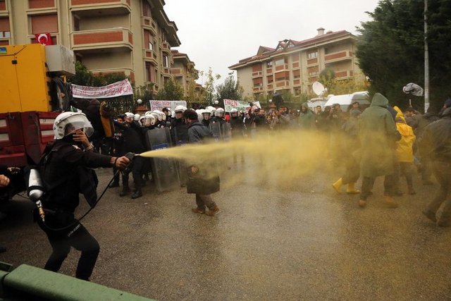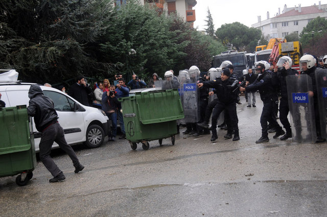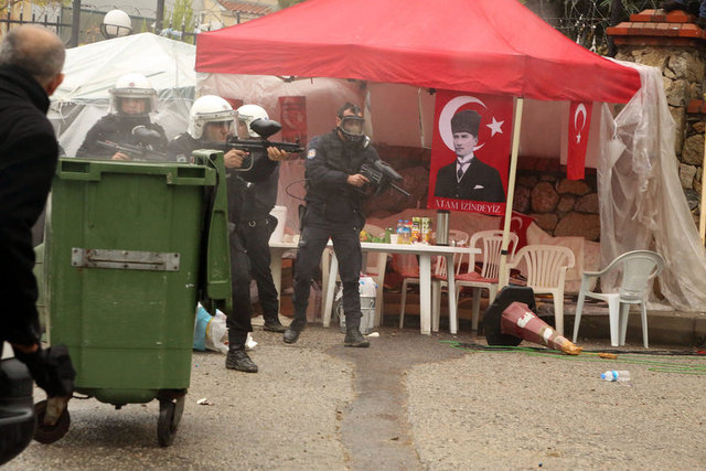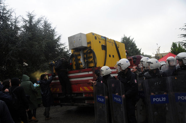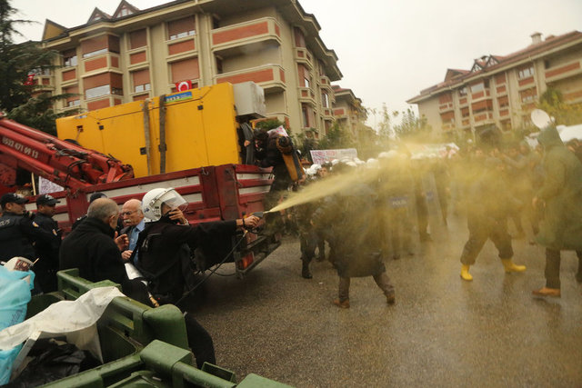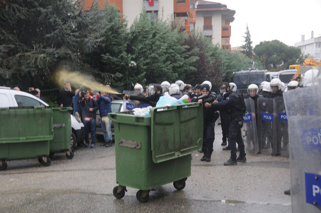 Dağılmamakta direnen eylemcilerin de polis kalkanlarını itmesi üzerine polisler, eylemcilerin üzerine biber gazı ve plastik mermi sıktı. Gazdan korunmaya çalışan bazı göstericiler, yol kenarındaki çöp kutularını polisin üzerine itti. Olaylar sırasında çok sayıda eylemci sıkılan gaz ve plastik mermilerden etkilenirken, gözlerindeki yanma ve vücutlarına isabet eden plastik mermilerin acısıyla civarda bulunan eczanelere koştu.