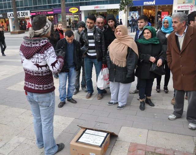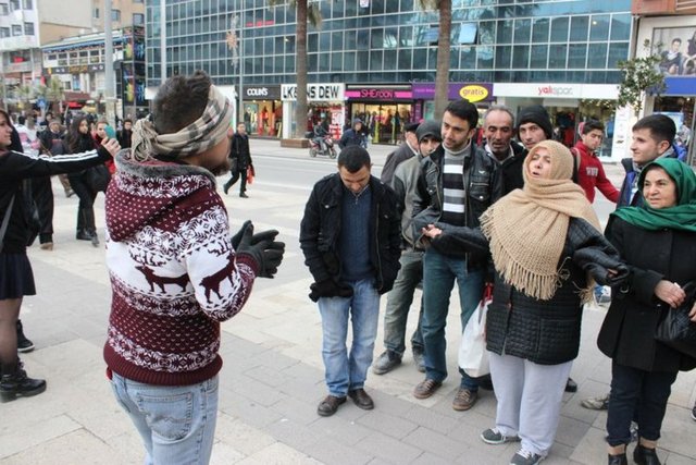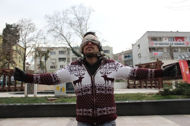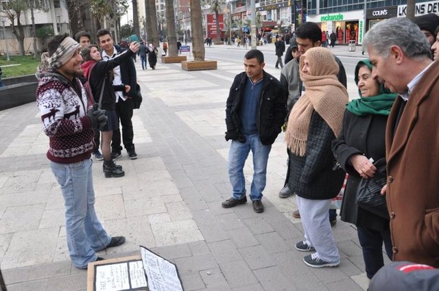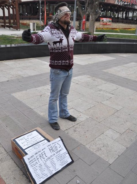 Denizli'de cadde ortasında sarılma eylemi yapan bir gence vatandaşlar ilginç tepkiler gösterdi. Bazı vatandaşlar gence sarılırken bir kadın ise, "Oğlum sen neden bu soğukta böyle duruyorsun? Sevgiye mi ihtiyacın var?" dedi