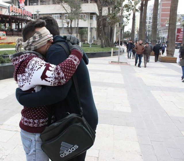 Vatandaşların sarıldığı anda caddeden geçen bir kadın, "Bu neden böyle duruyor? Ne anlatmak istiyor? Sevgiye ya da ilgiye mi ihtiyacı var? Amacını ben anlamadım. Üç gündür bu çocuk böyle dikiliyor" dedi.