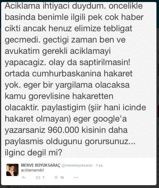 Açıklama ihtiyacı duydum. Öncelikle basında benimle ilgili pek çok haber çıktı ancak henüz elimize tebligat geçmedi. Geçtiği zaman ben ve avukatım gerekli açıklamayı yapacağız. Olay da saptırılmasın. Ortada Cumhurbaşkanı'na hakaret yok. Eğer bir yargılama olacaksa 'kamu görevlisine hakaretten' olacaktır. Paylaştığım şiiri (hani içinde hakaret olmayan) eğer Google'a yazarsanız 960 bin kişinin daha paylaşmış olduğunu görürsünüz... İlginç değil mi?