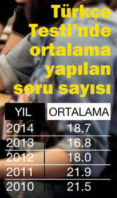 Yükseköğretime Geçiş Sınavı’nda (YGS) gençlerin en başarılı oldukları test Türkçe Testi. 40 sorunun yer aldığı bu testin geçen yıl yapılma ortalaması tüm adaylar için 18.7 oldu. 2013 yılında bu oran, her biri 144 kelimeyi bulan uzun paragraflı sorular yüzünden 16.8’e kadar gerilemişti. Tüm testlerde olduğu gibi Türkçe Testi’nde de başarı oranı giderek düşüyor. 2011 yılında 40 soruluk testte ortalama 21.9 soru çözülüyordu.