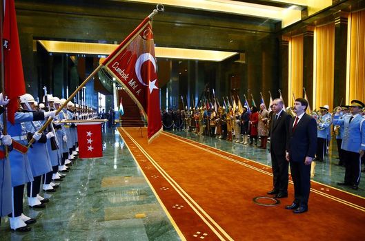 Cumhurbaşkanı Recep Tayyip Erdoğan, resmi ziyaret için Türkiye'de bulunan Macaristan Cumhurbaşkanı Janos Ader'i törenle karşıladı. Törende 16 Türk devleti temsil eden askerler bu kez bandonun yanında durdu.