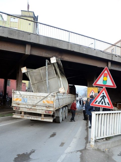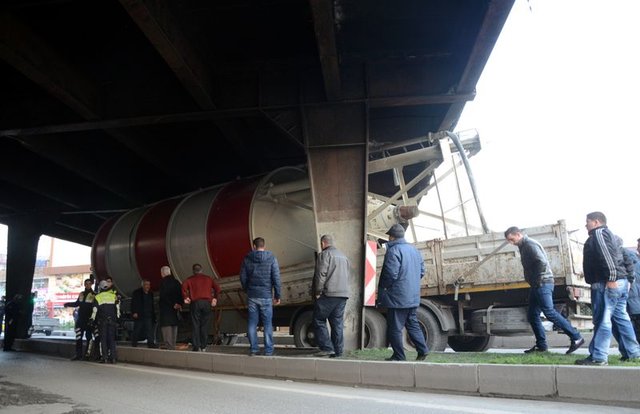 Zonguldak'ta TIR'ın dorsesinde taşıdığı beton silosu 4 metre 20 santim yüksekliğindeki köprüye sıkıştı.