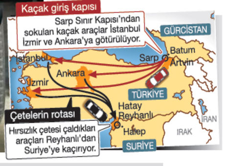 Öte yandan otomobil hırsızlarından oluşan çeteler, İstanbul, Ankara ve İzmir gibi büyük kentlerden çaldıkları lüks otomobilleri Hatay Reyhanlı üzerinden Suriye’ye götürüyor. Otomobiller, Türkiye sınırına 40 kilometre uzaklıkta kurulan 3 ayrı otomobil pazarında satılıyor. Lüks marka cip ve otomobillerin bu pazarlardaki satış fiyatı da 5 ile 15 bin Euro arasında değişiyor. Otomobil pazarlarında Türk plakalı araçların yanı sıra Bulgar ve Romanya plakalı otomobiller de bulunuyor. Hırsızlık çeteleri, her ilden yaklaşık 8-10 araç çalıp Hatay’a doğru hareket ediyor. Bu araçların GPRS araç takip sistemleri İskenderun’da sökülüyor ve araçlar Hatay Reyhanlı kırsalındaki patika yollardan Suriye’ye götürülüyor. Hırsızlık çeteleri bazı durumlarda çaldıkları araçları gerçek sahiplerine 10-15 bin dolara geri satıyor.