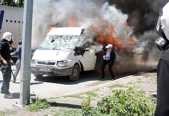 İtfaiye ekipleri de araca su sıkarak söndürdü. Burada çıkan olaylarda bir polis memuru da başından yaralandı.