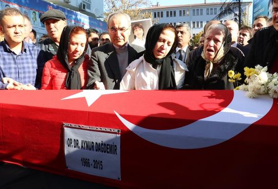 20 yaşında ikiz kız çocuğu annesi olan Dr. Aynur Dağdemir'in Türk Bayrağı'na sarılı tabutunu görenler gözyaşlarını tutamadı. Eşi Ondokuz Mayıs Üniversitesi Tıp Fakültesi Çocuk Sağlığı ve Hastalıkları Anabilim Dalı Başkanı Prof. Dr. Ayhan Dağdemir, Tıp Fakültesi öğrencisi olan kızı Başak, Hukuk Fakültesi öğrencisi olan kızı Tuğçe, annesi Aysel Gölpınar cenaze töreninde güçlükle ayakta durabildi. Tabuta sarılıp gözyaşı döken yakınları güçlükle sakinleştirilmeye çalışıldı. Anne Aysel Gölpınar, "Kızım ben seni çiçek satarak büyütüp okuttum. Nereye gidiyorsun" diye ağıt yaktı.