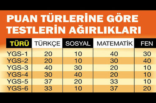 İşte sınavda çözeceğiniz her sorunun değeri de bu puanlara göre değişiyor. Çünkü testlerin ağırlık katsayıları her puan türünde farklı olacak. Örneğin sayısal puanların oluşmasında Temel Matematik yüzde 40, Fen Bilimleri yüzde 30 oranında etkili. Ama bu puanın oluşmasında Türkçe yüzde 20, Sosyal Bilimler de yüzde 10 oranında katkı yapıyor.